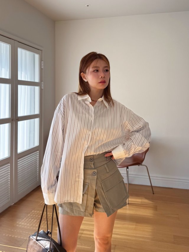 條紋拼接翻領長袖襯衫(LIVE SALE)