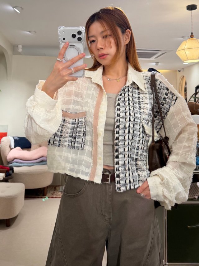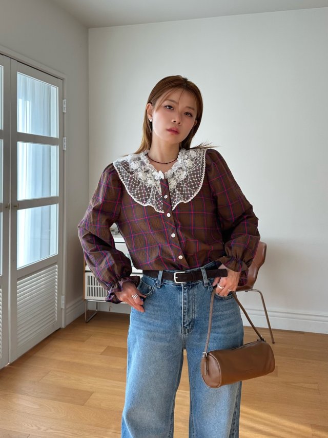 Lace花邊拼接格紋長袖襯衫上衣(LIVE SALE)