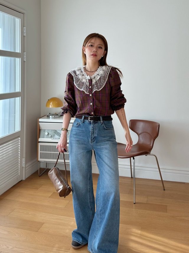 橡根腰牛仔拼接lace鏤空長褲(LIVE SALE)