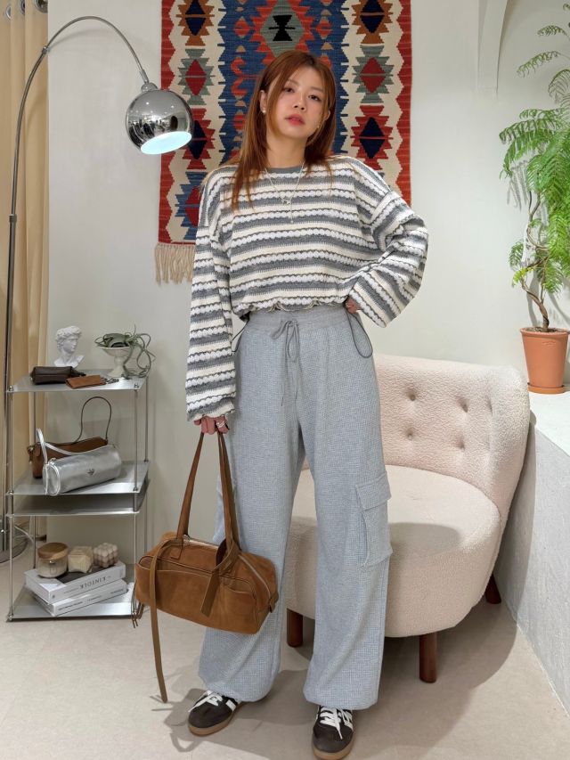 橡根腰抽繩華夫格休閒長褲(LIVE SALE)