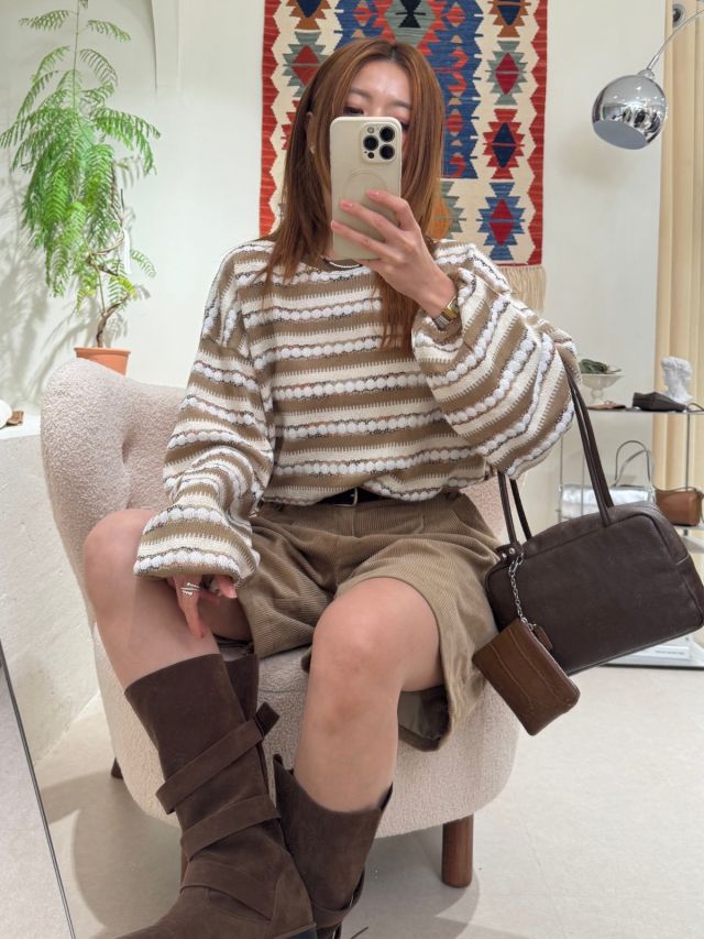 條紋寬鬆抽繩針織上衣(LIVE SALE)