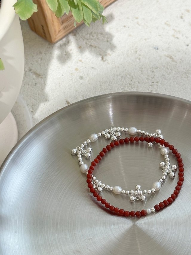 925Sliver紅瑪瑙串珠手鏈+銀串珠花朵手鏈SET(LIVE SALE)