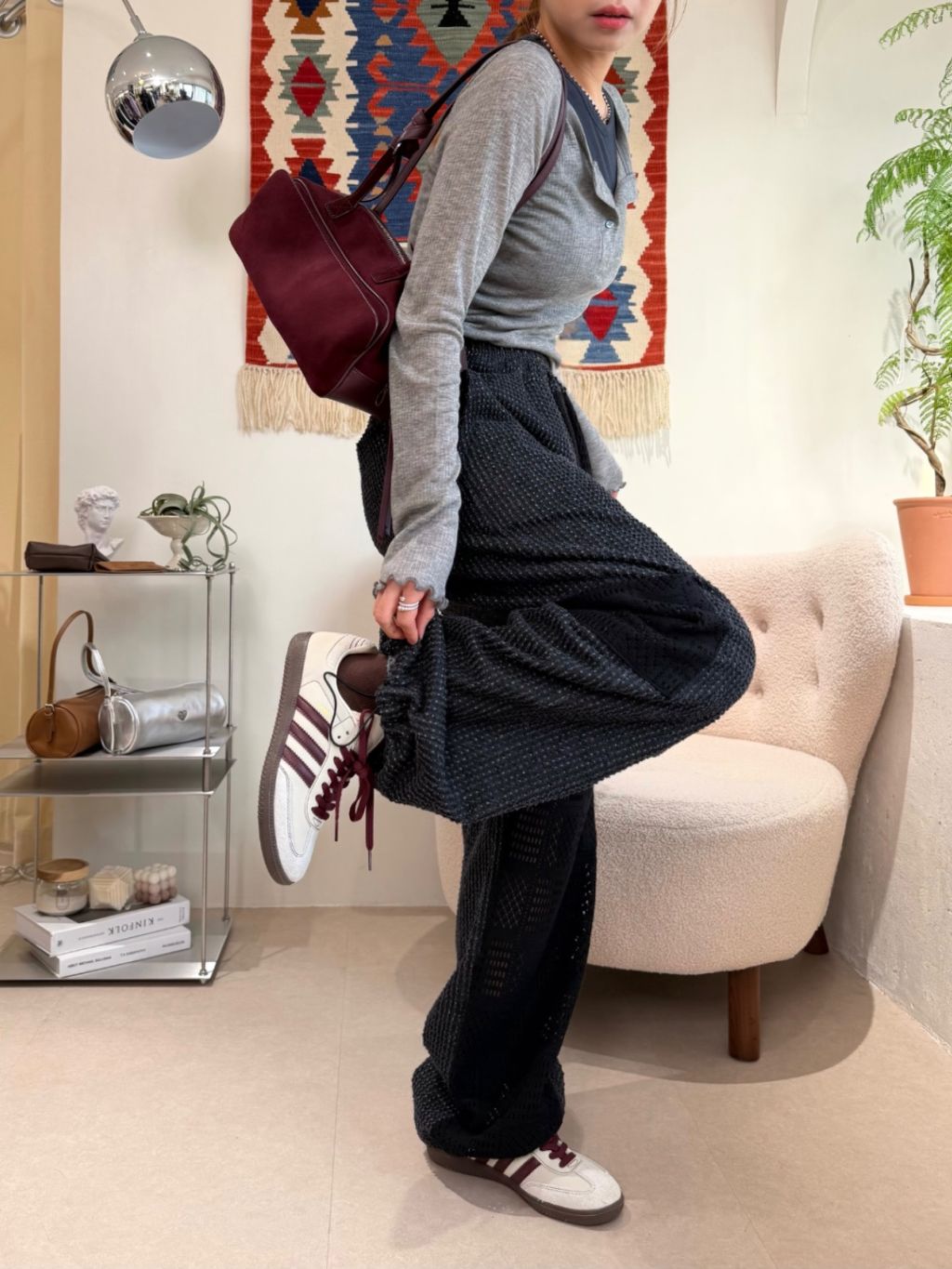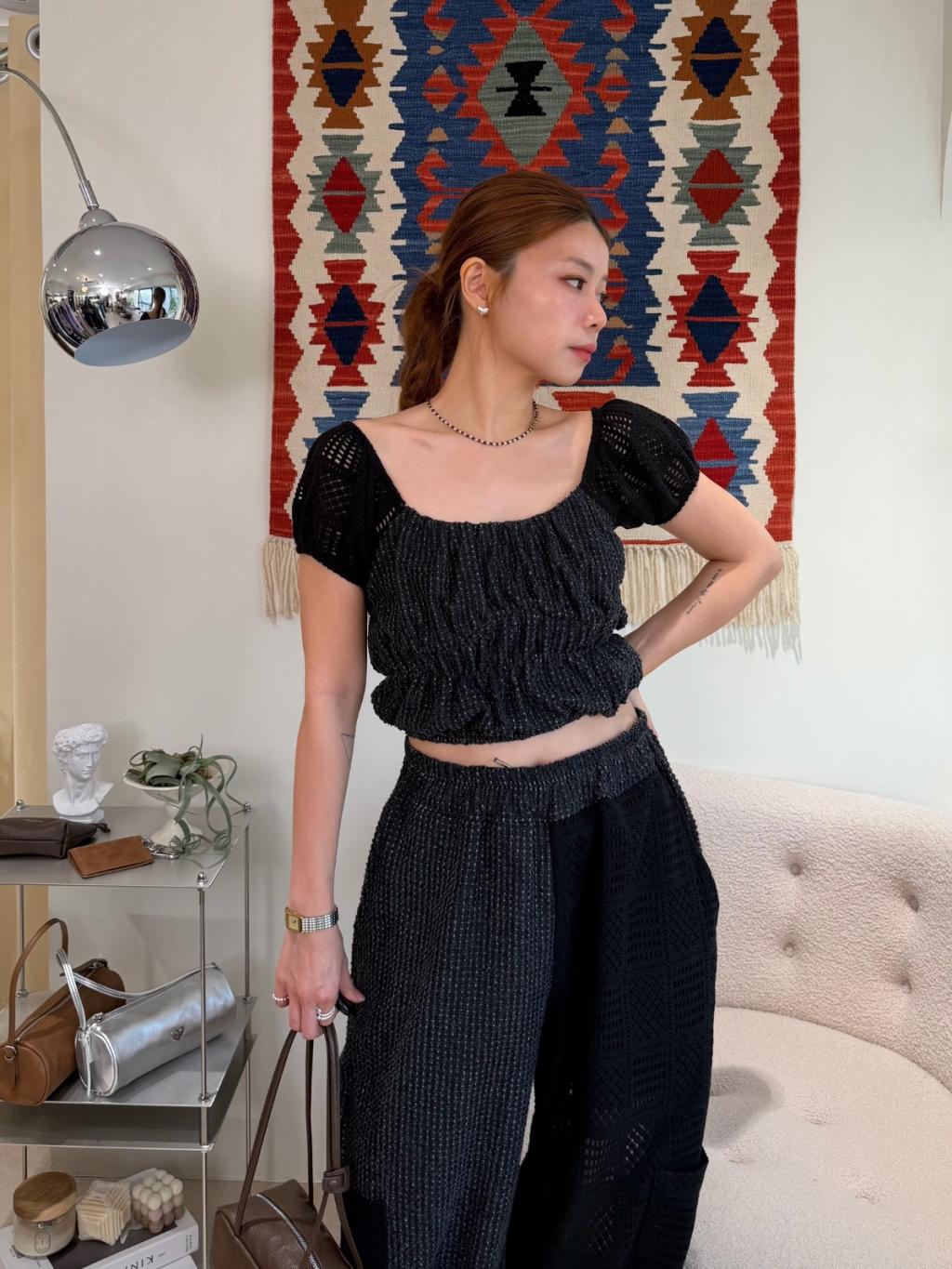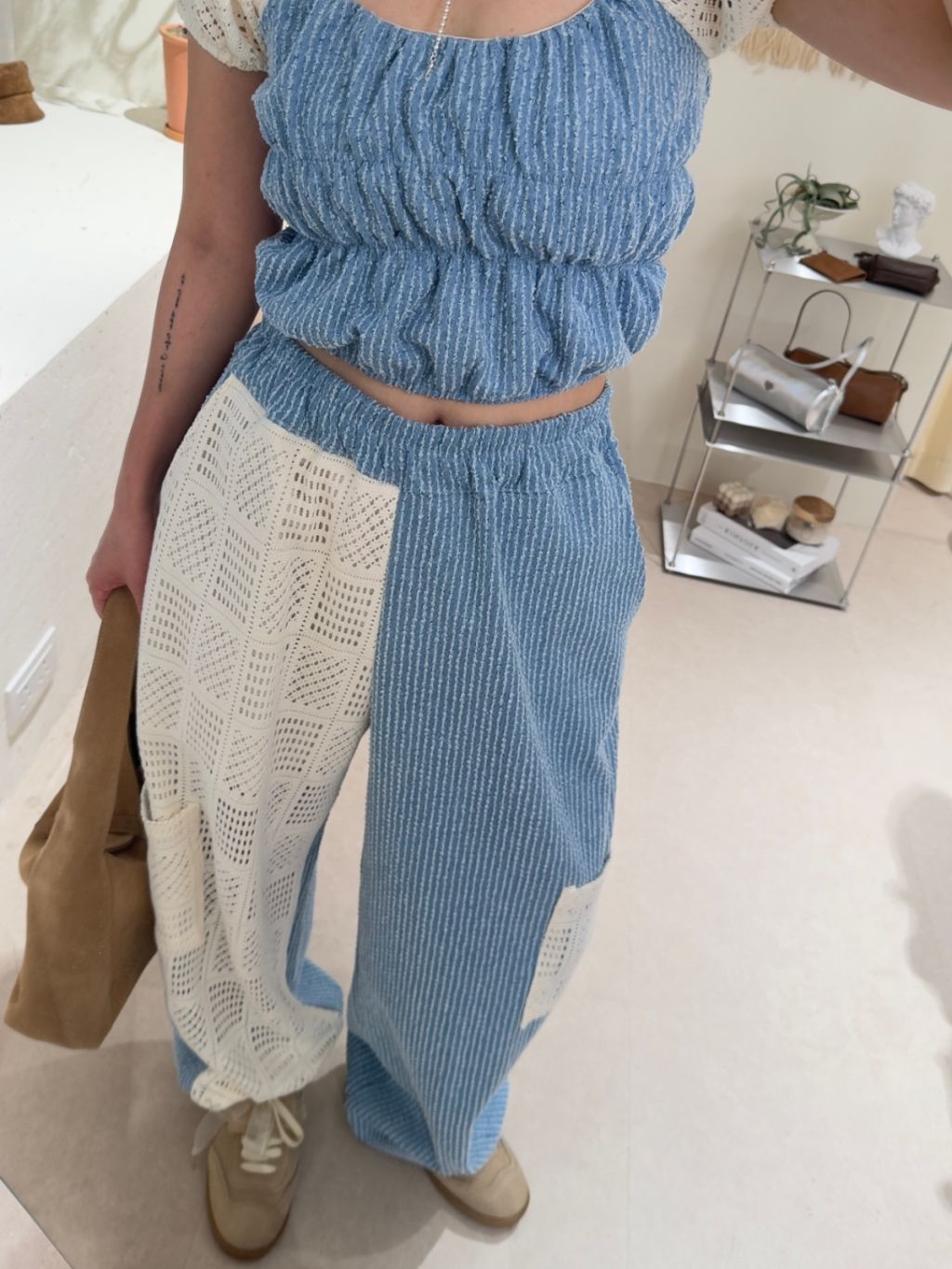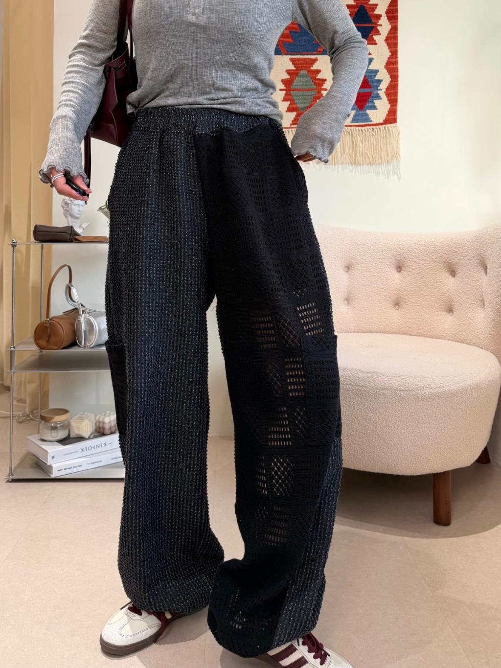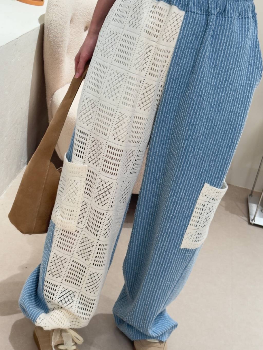 橡根腰牛仔拼接lace鏤空長褲(LIVE SALE)