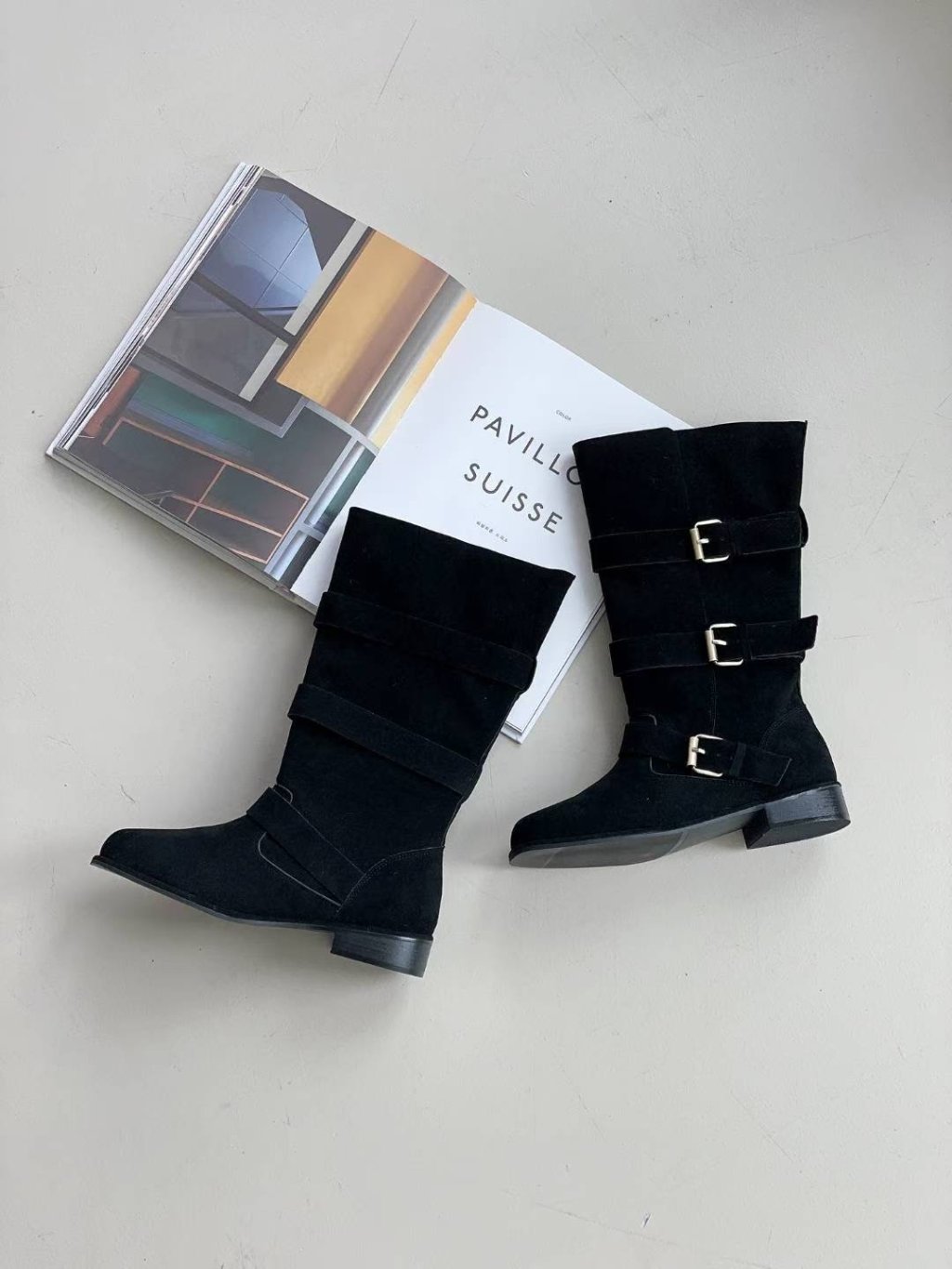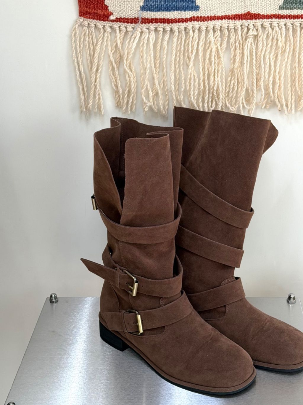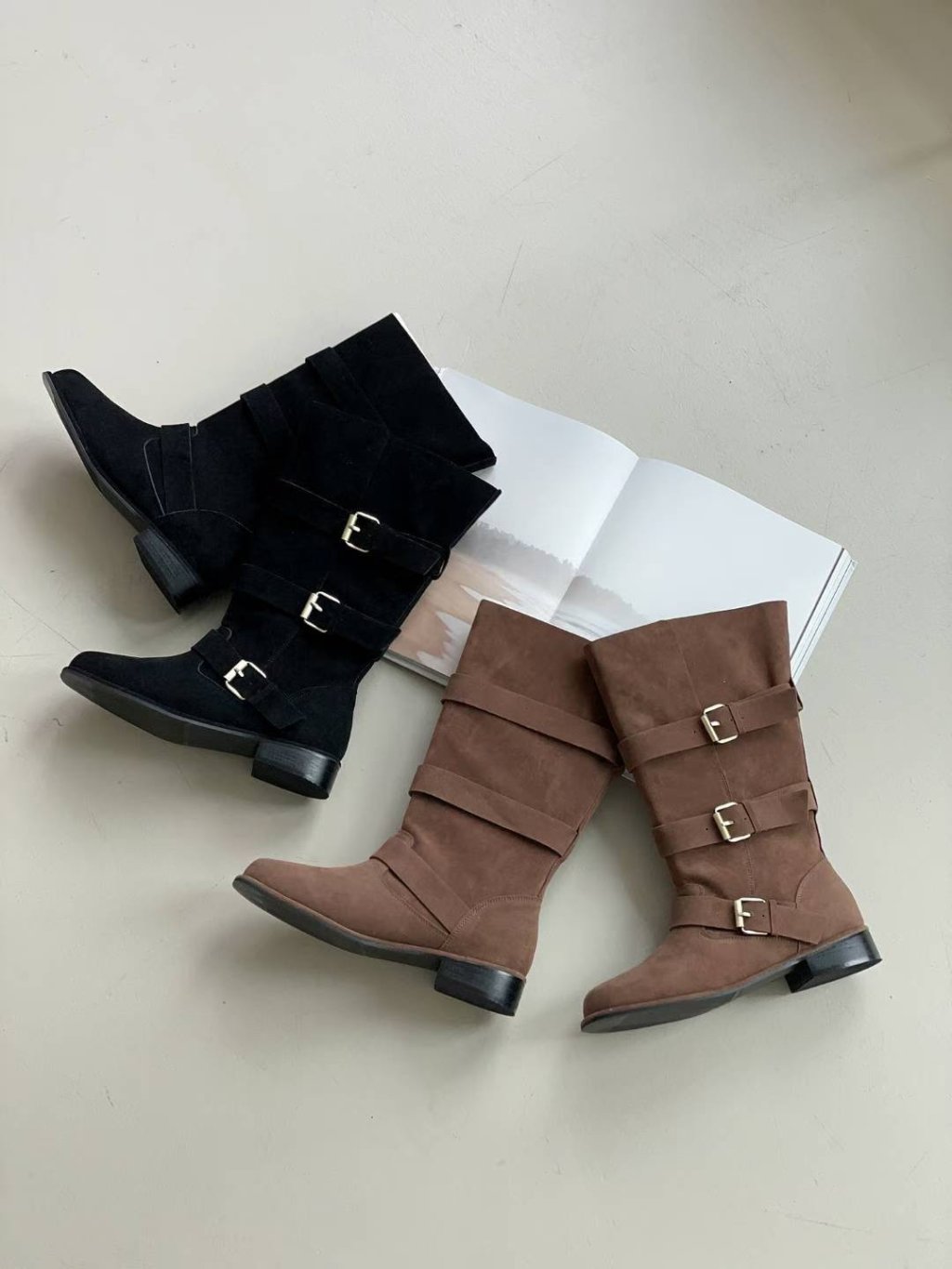 麂皮方頭皮帶中筒靴(LIVE SALE)