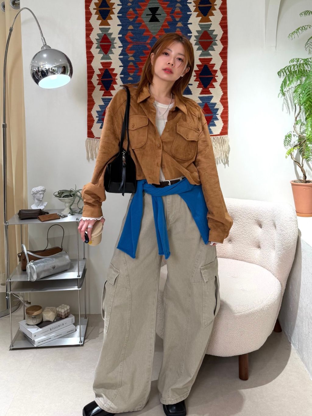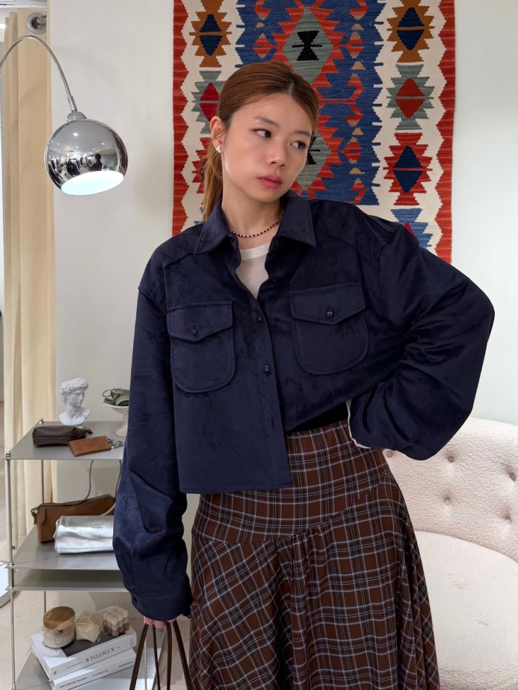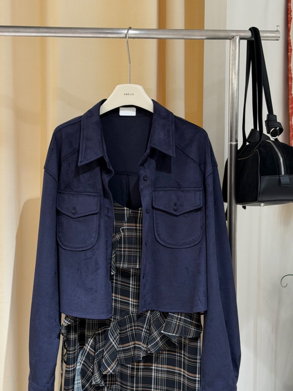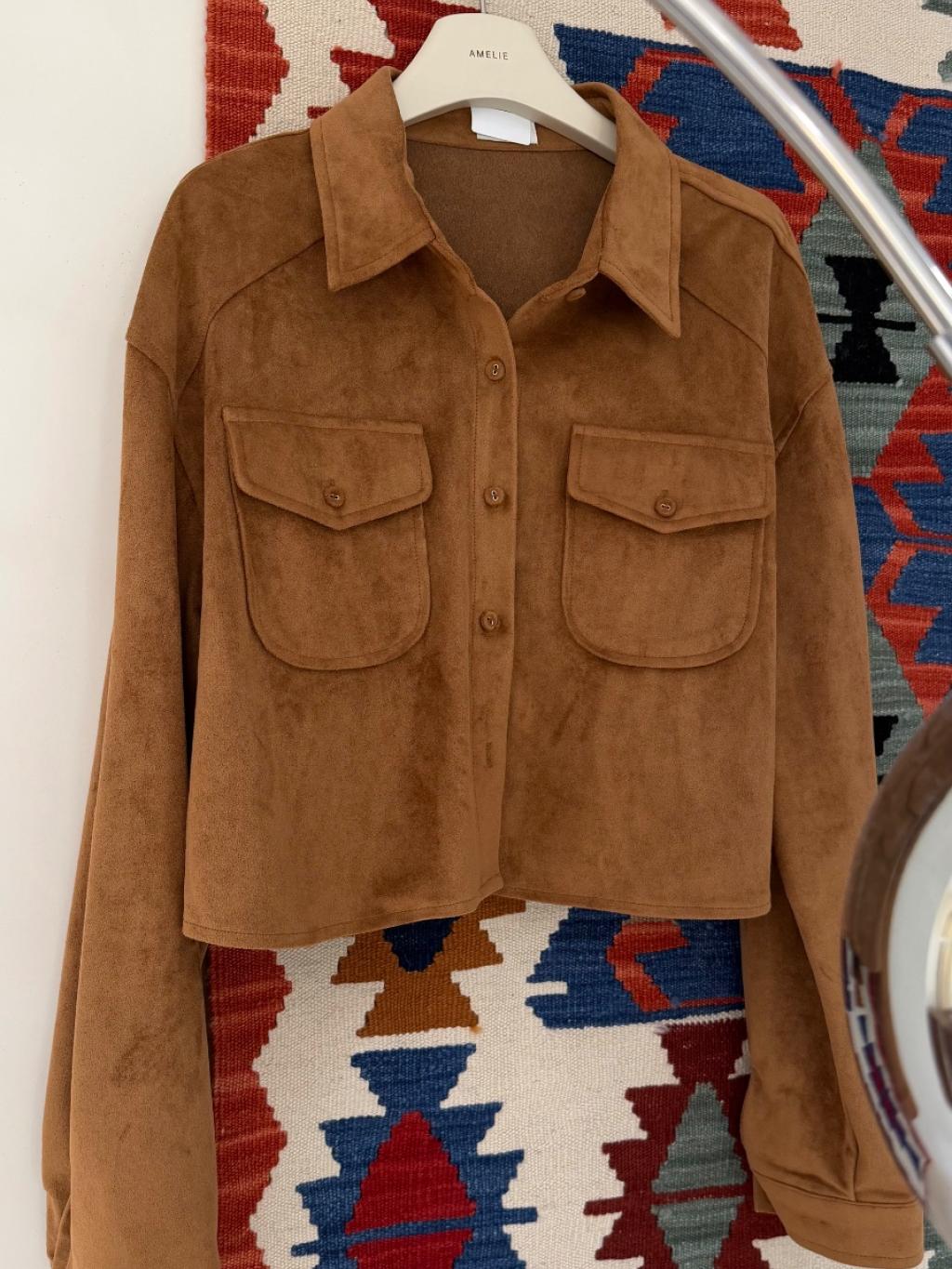 鹿皮絨口袋翻領短款長袖襯衫(LIVE SALE)