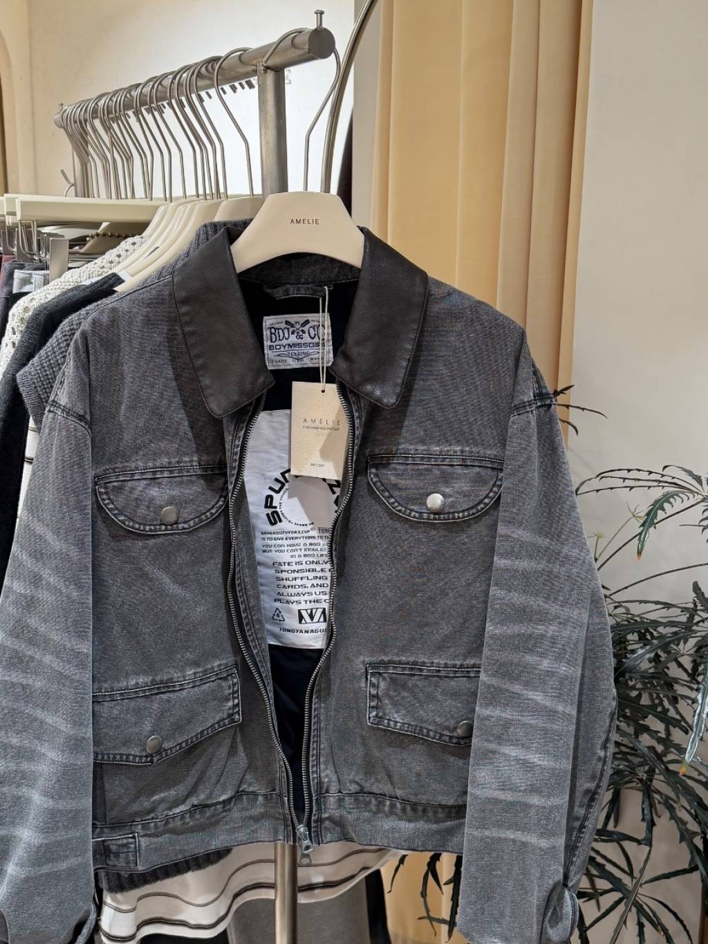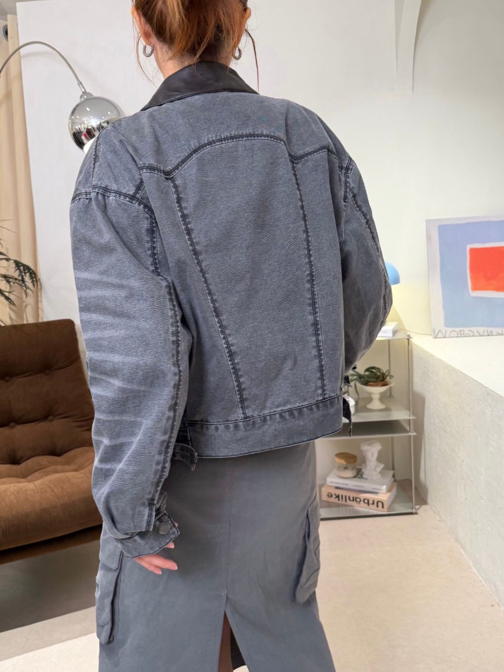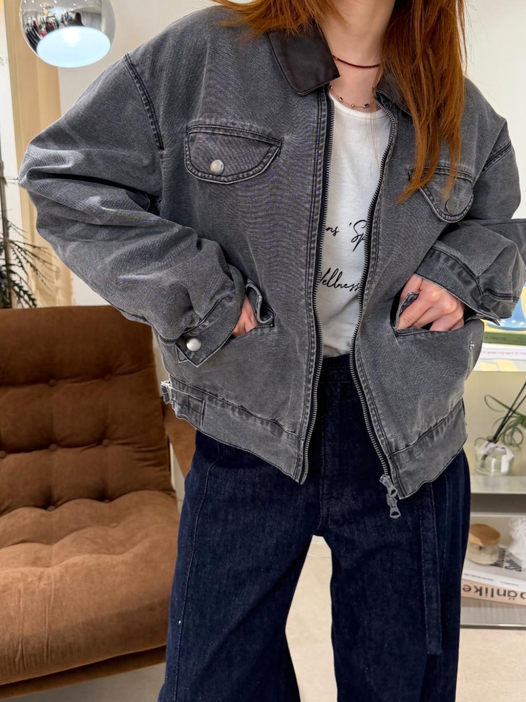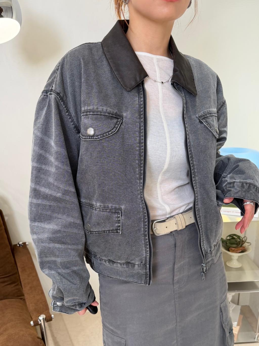 水洗灰拼接皮領夾克(LIVE SALE)