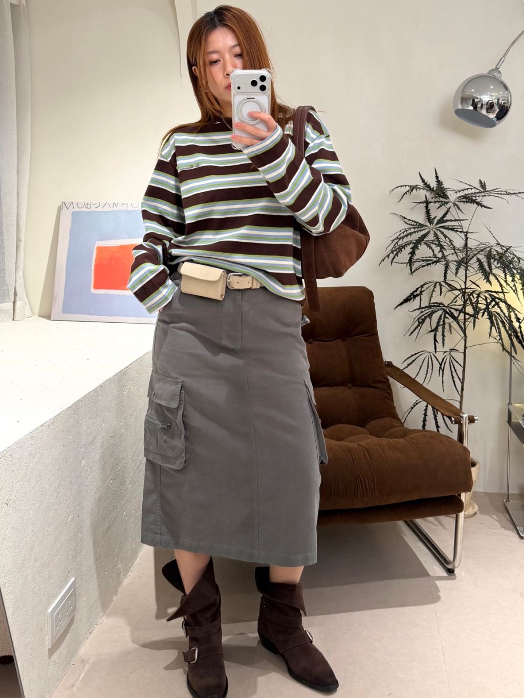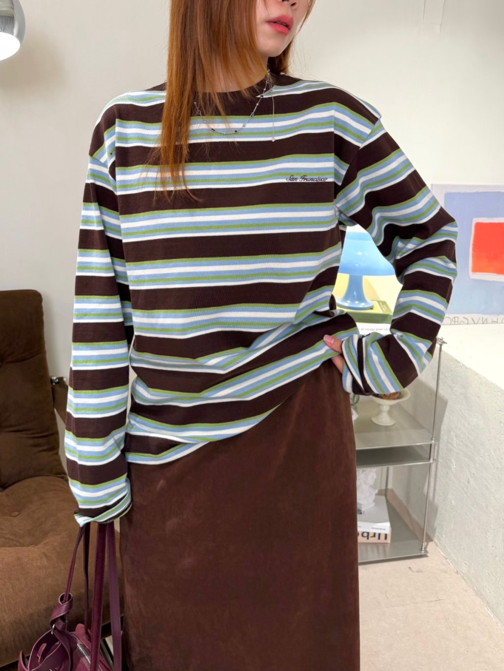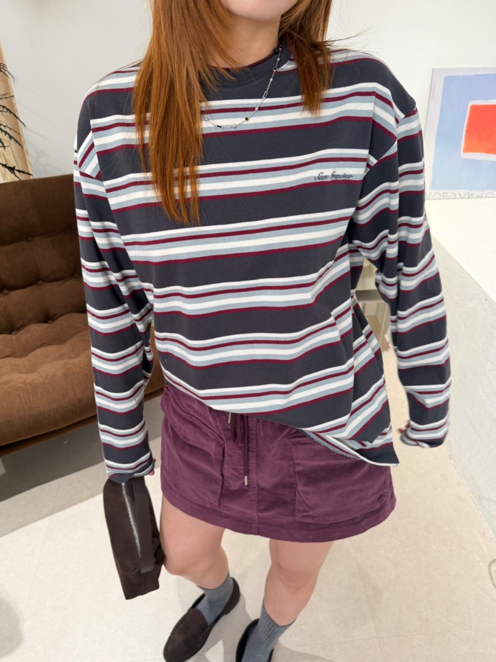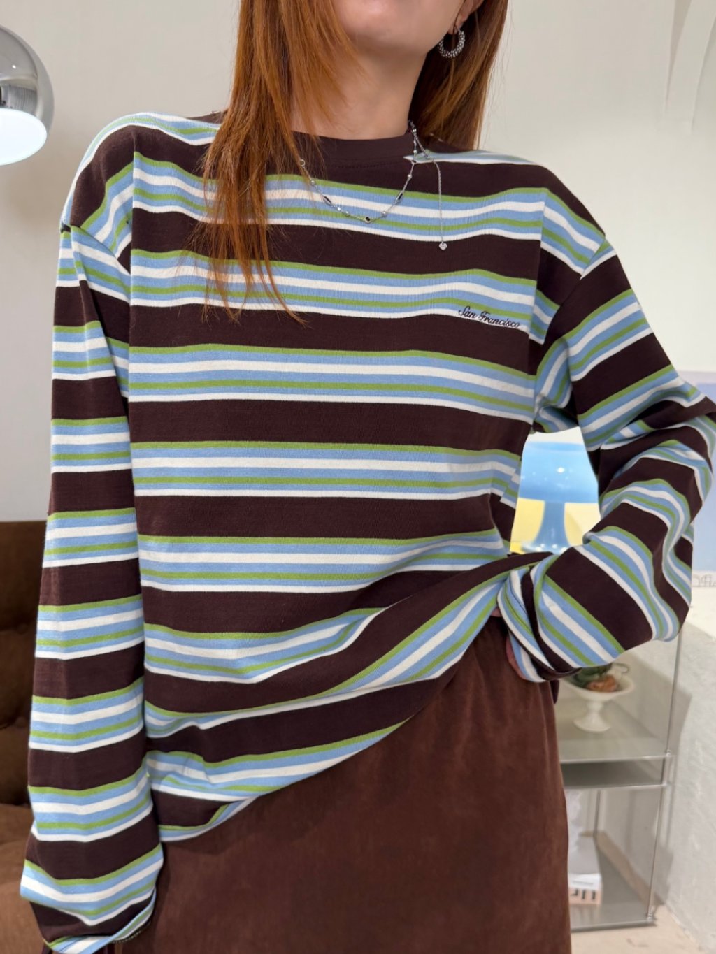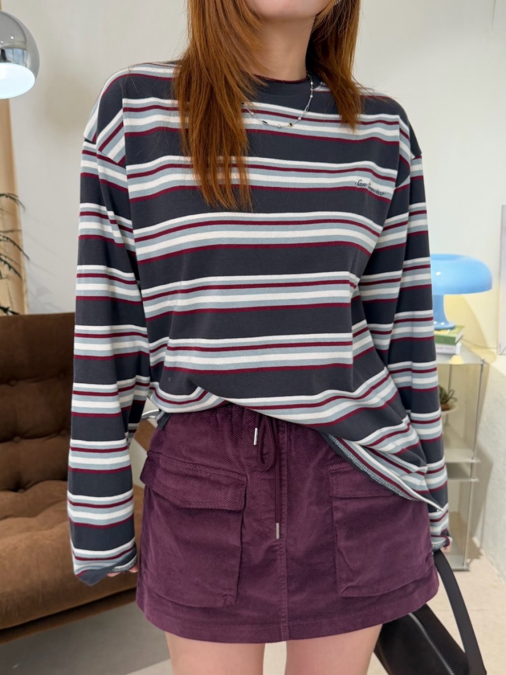圓領刺繡印字條紋長袖TEE(LIVE SALE)