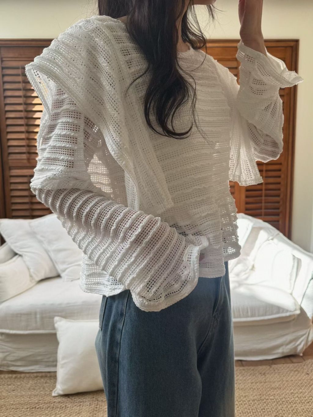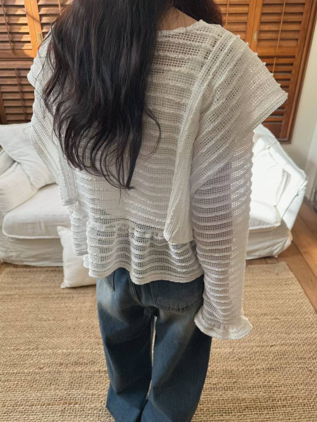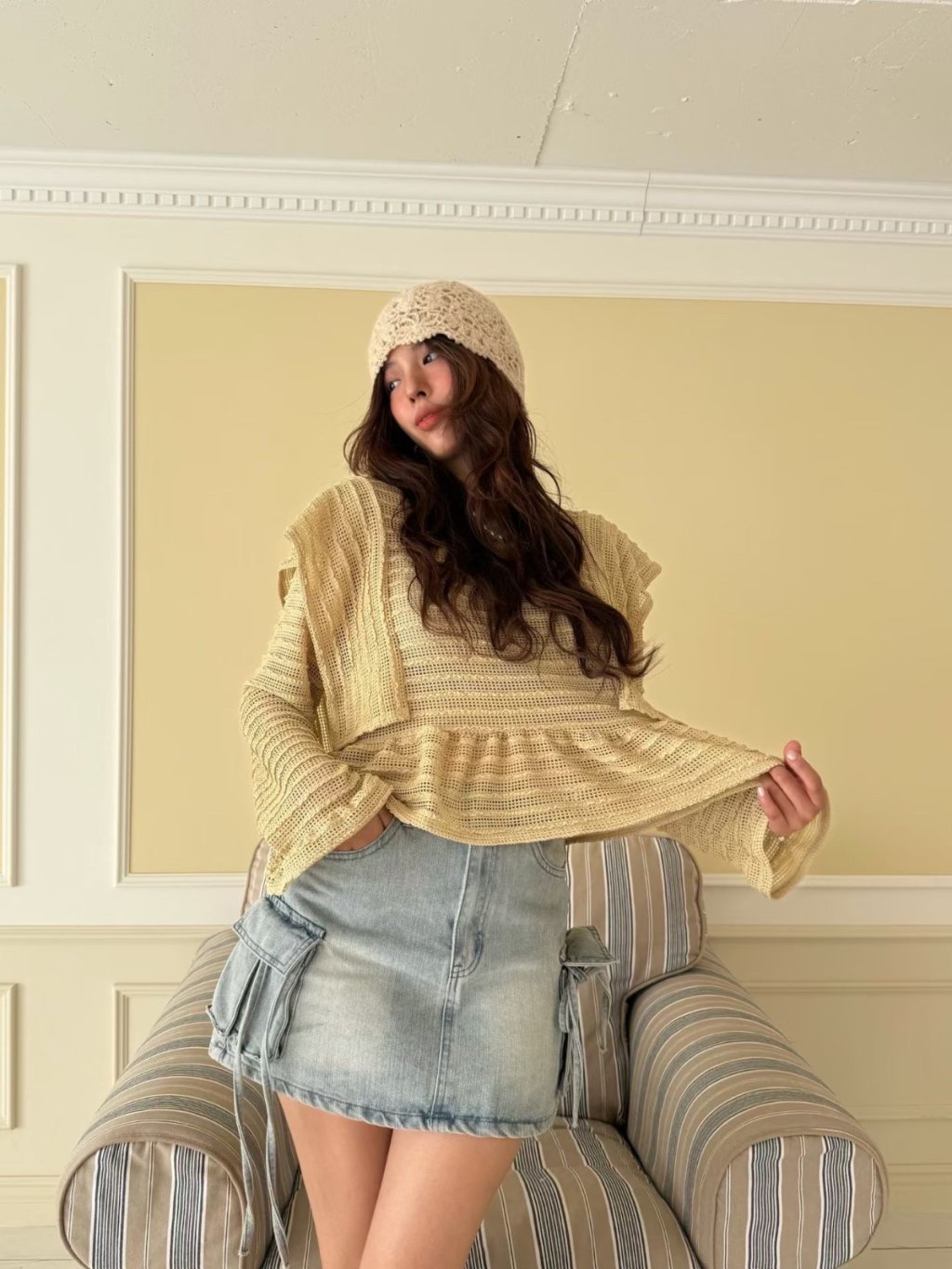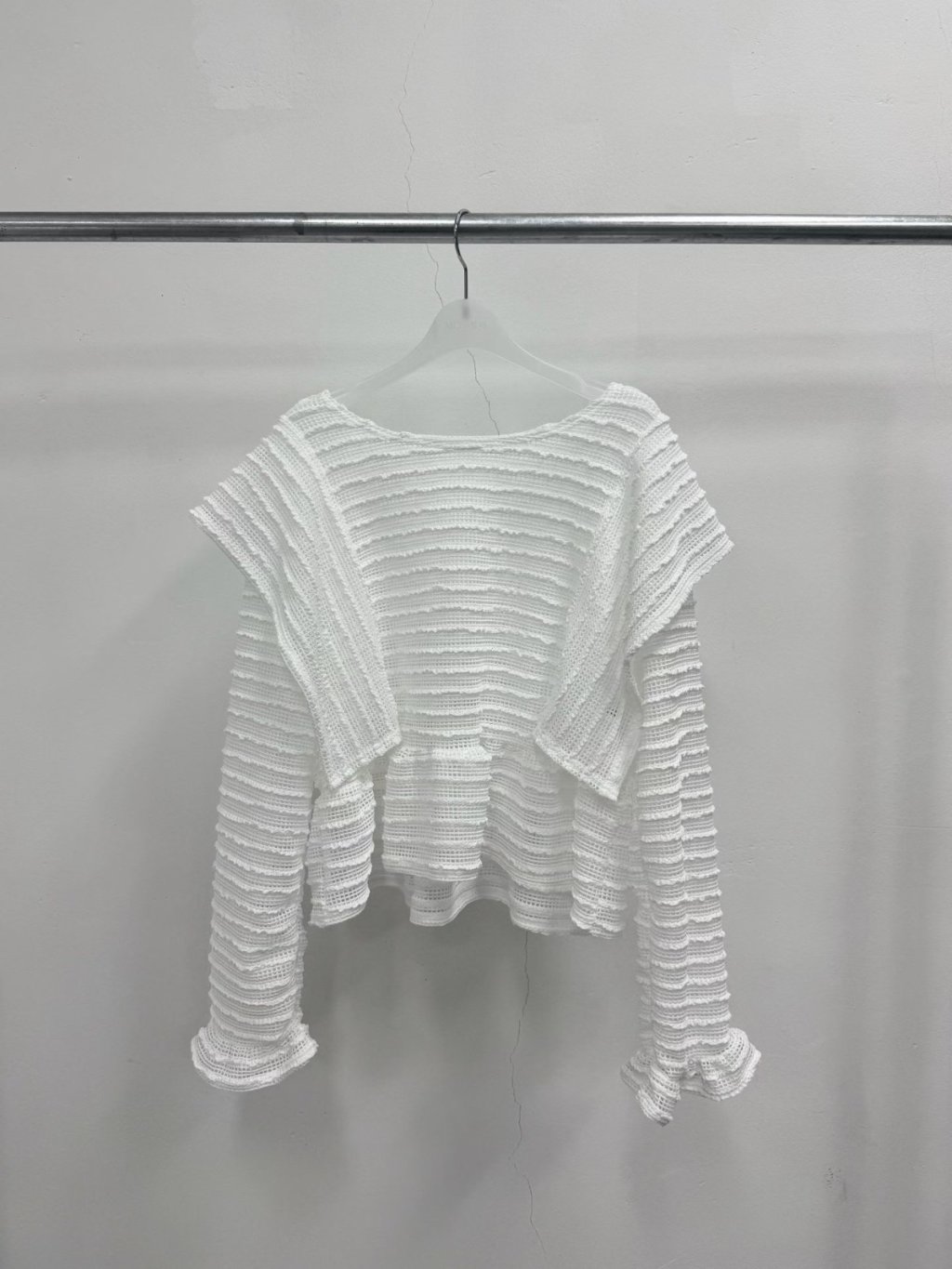 LACE條紋花邊飛袖鏤空針織長袖上衣