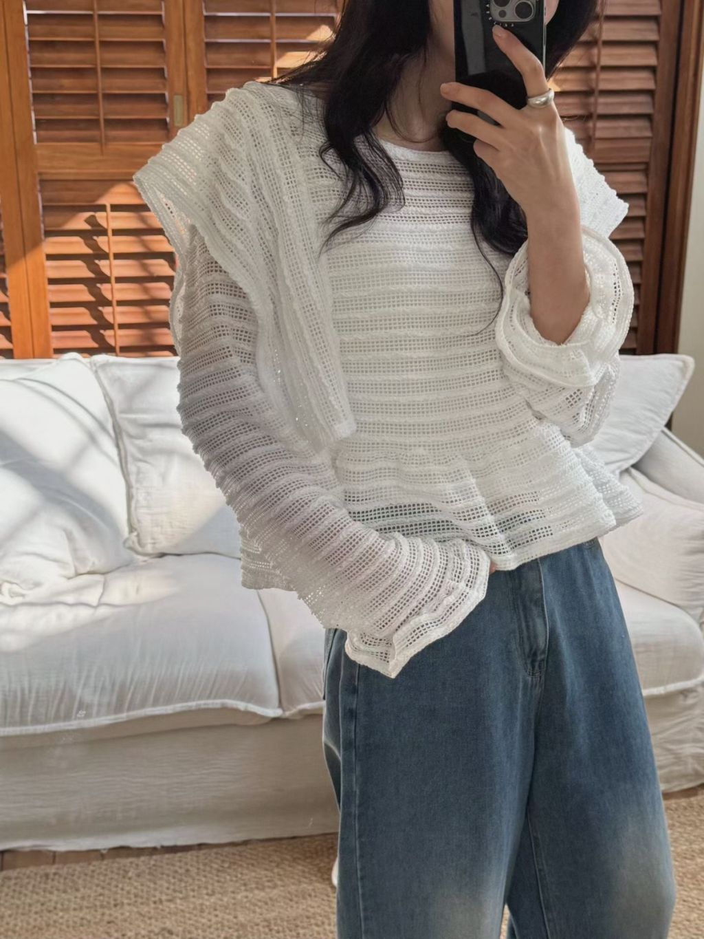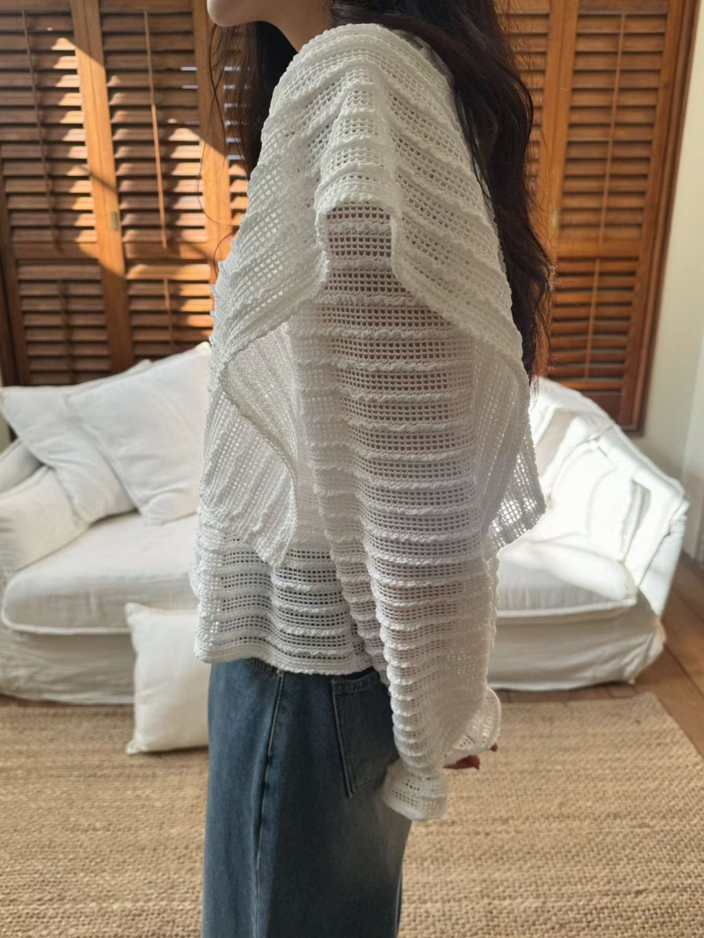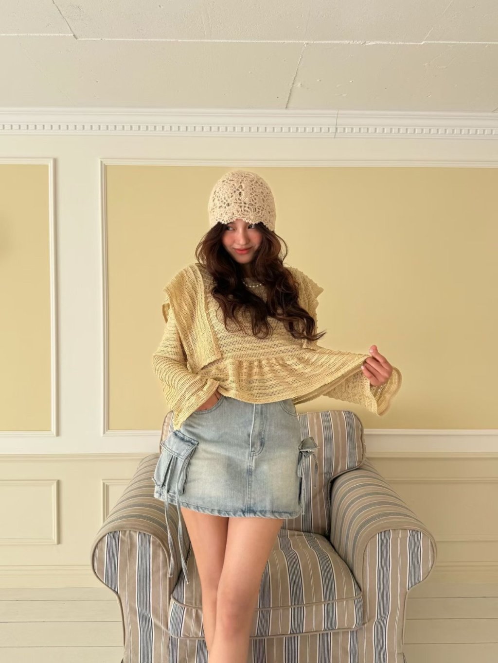 LACE條紋花邊飛袖鏤空針織長袖上衣