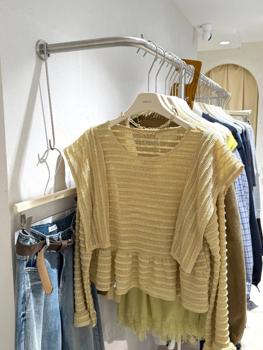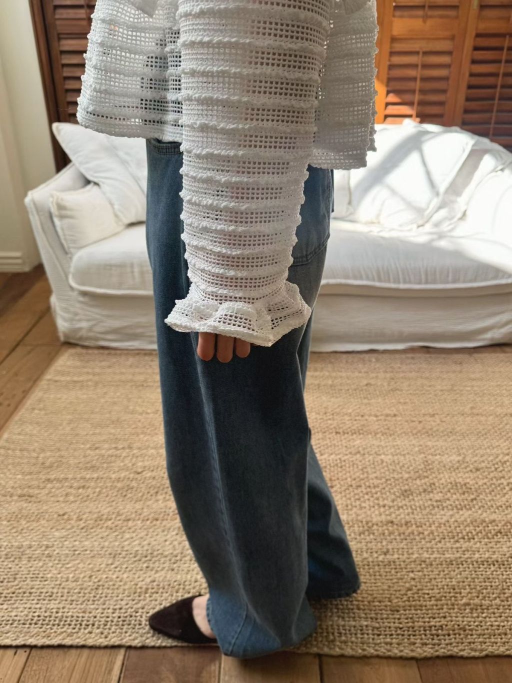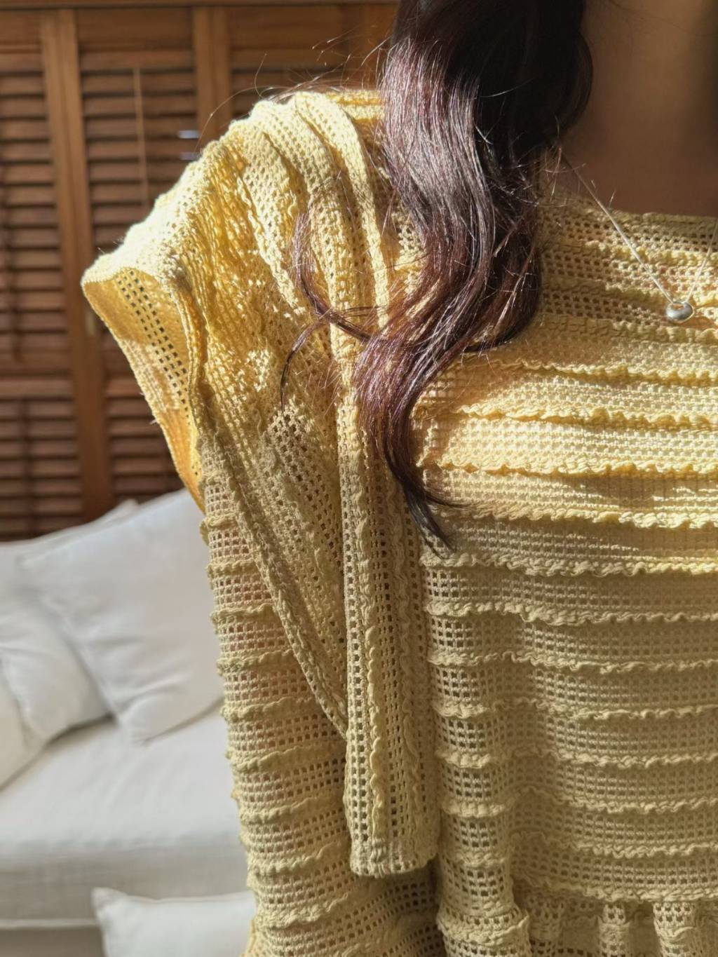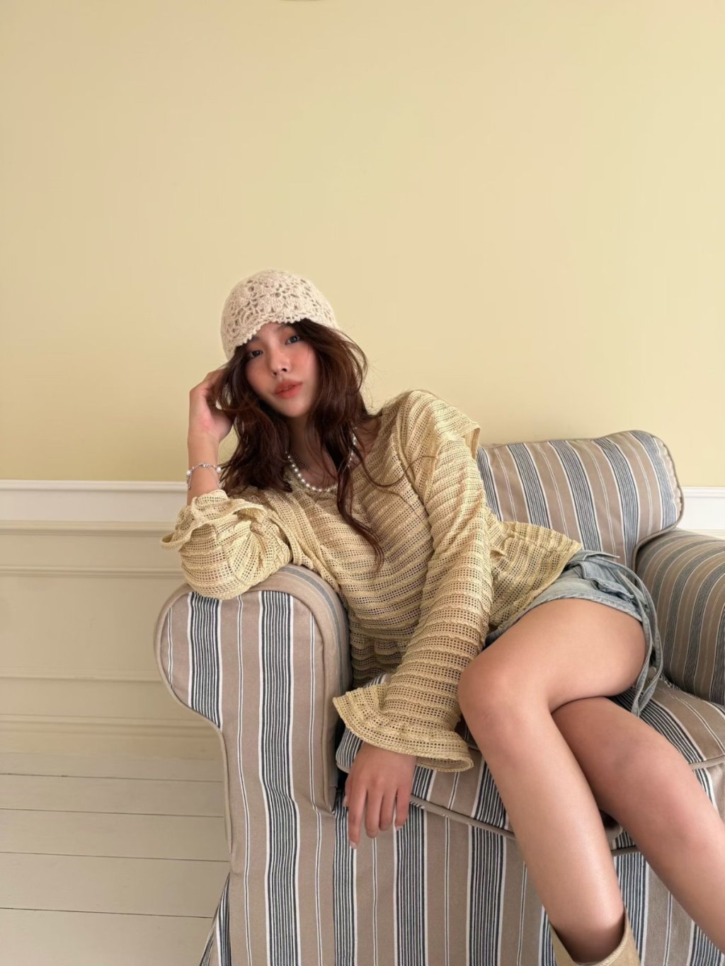 LACE條紋花邊飛袖鏤空針織長袖上衣