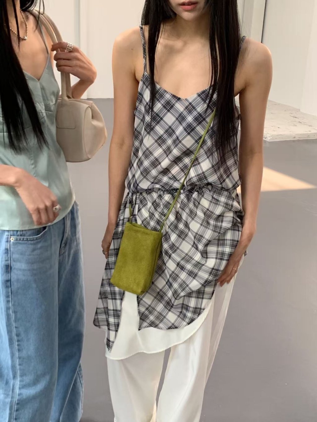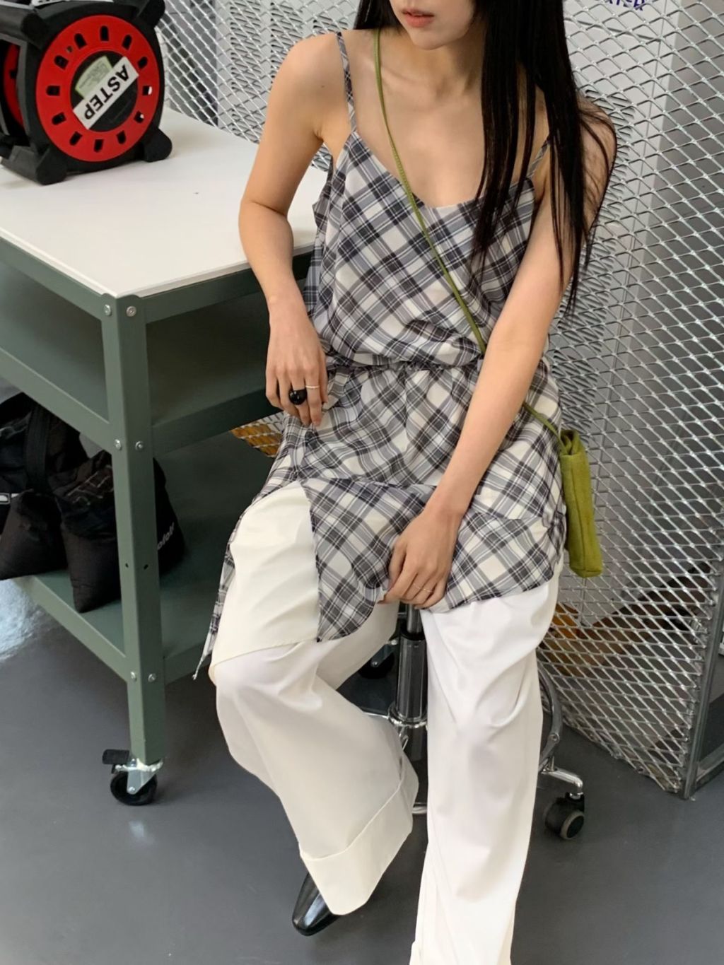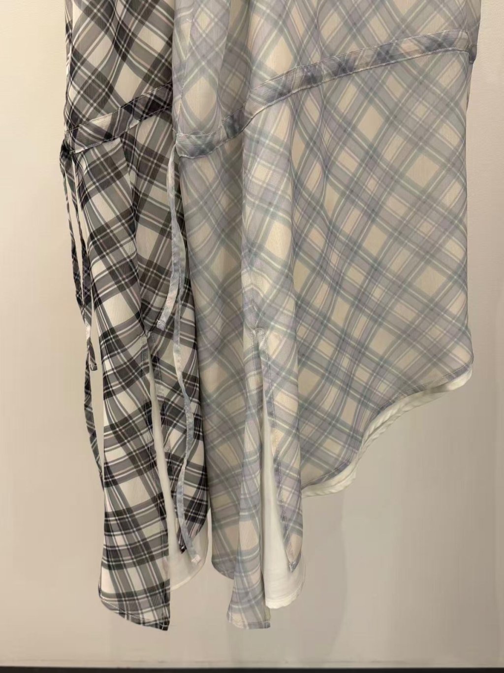 主頁 格紋吊帶抽繩不規則連衣裙OPS