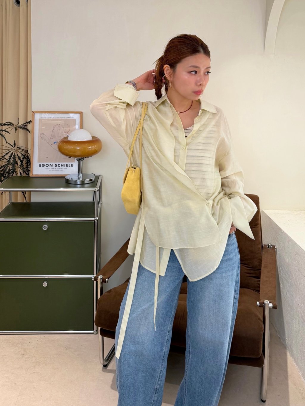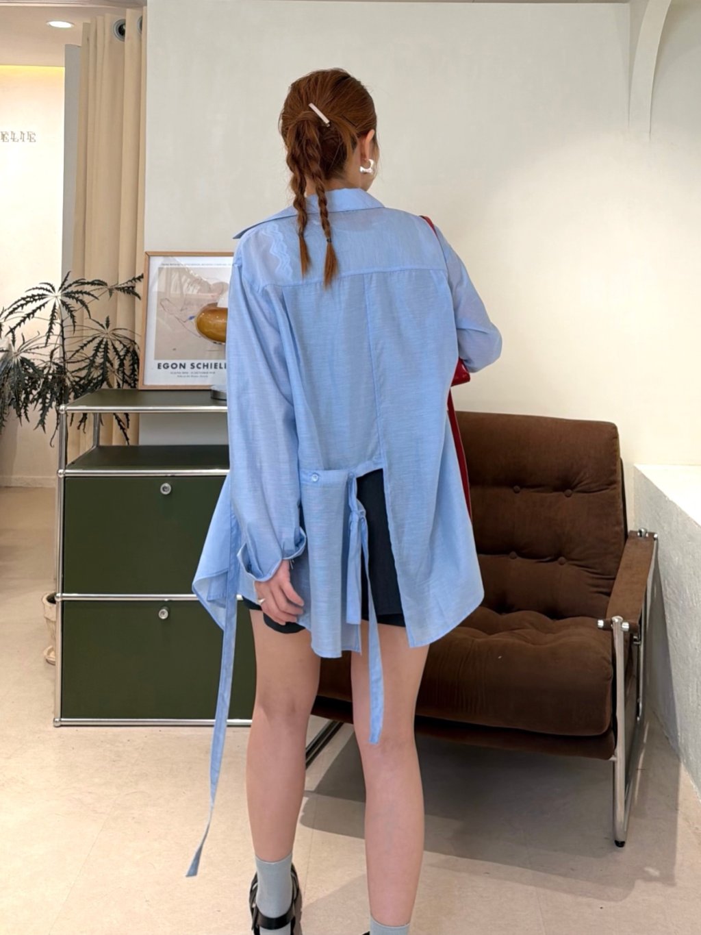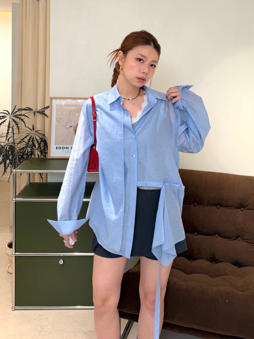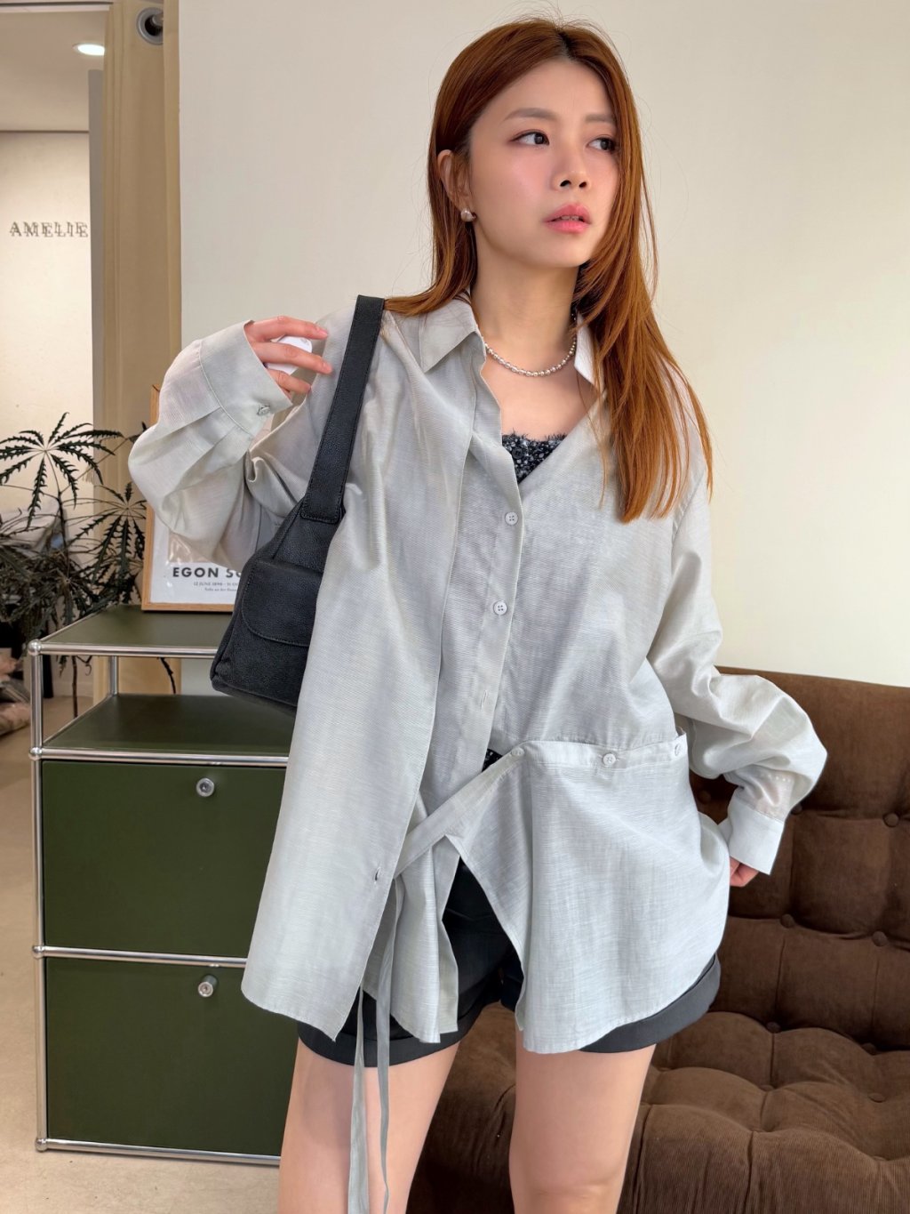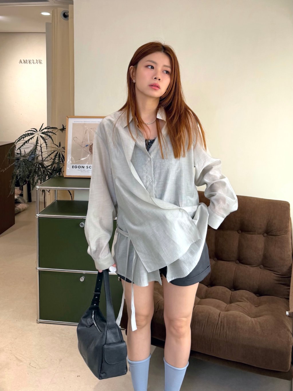 側扣不規則綁帶長袖襯衫(LIVE SALE)